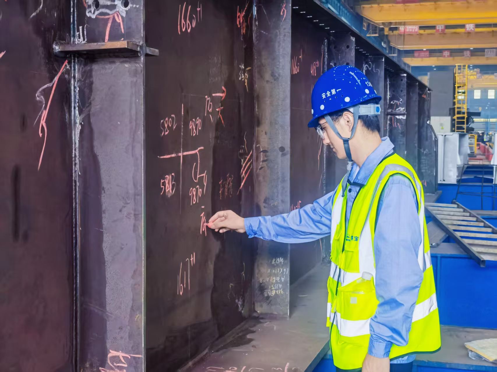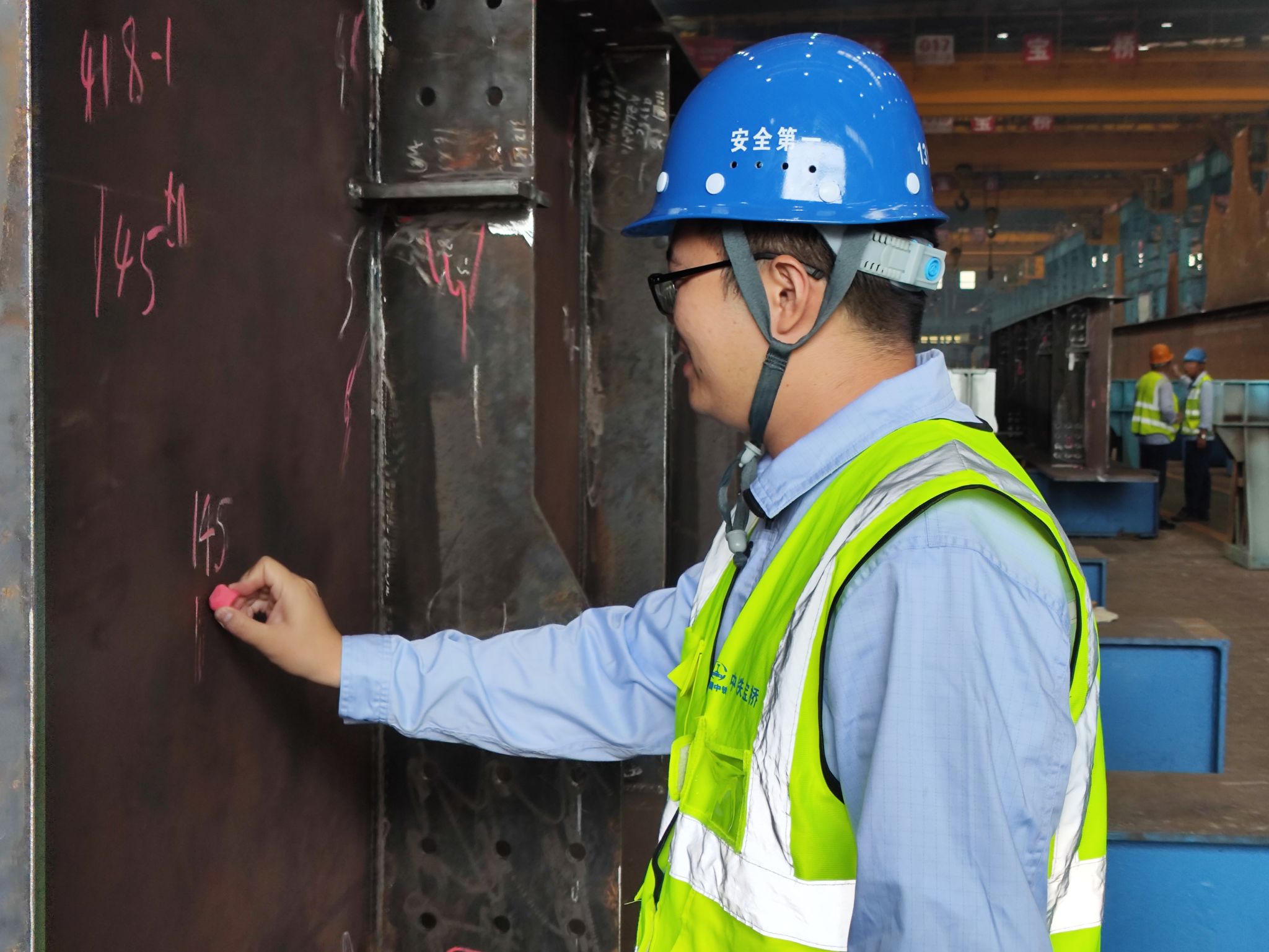 蒋志涵:我参与了312国道项目纵梁和斜撑的首件制作,学习了工艺流程,包括组织焊工考试,盖板和腹板对接,盖板和腹板焊接,焊缝探伤,划横基线和纵基线,肋板划线和焊接,焊接后调直,加劲肋、横梁连接处、上翼缘、端腹板打孔划线,样板定位打孔,检查构件尺寸,孔径和焊缝外观等。师傅详细讲解了每道工序,基本熟悉了工艺流程。