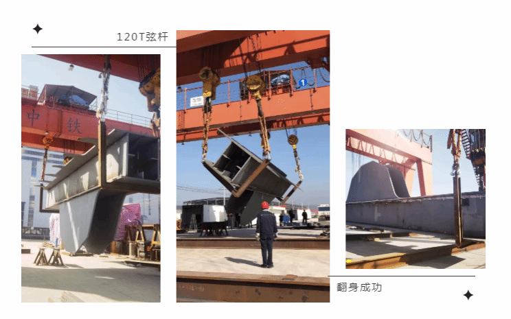 为顺利完成120吨弦杆生产制作任务,路桥公司钢结构二车间自生产以来,科学安排工艺布局,不断优化施工方案,制定一系列冬季厚板焊接保温措施,保证了产品焊接质量。经反复对场地、起重能力及吊具承载力的验算论证,杆件翻身采用两台75t门吊悬挂L吊具进行作业。