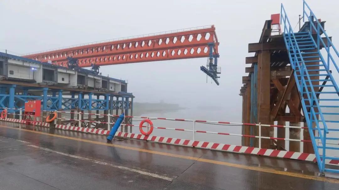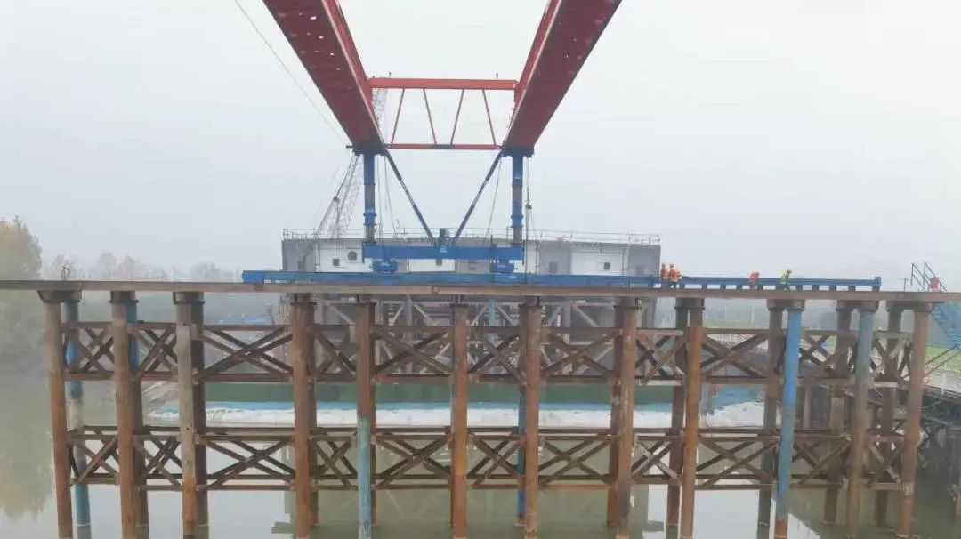 2022年11月10日,路桥公司承制的咸阳高科一路跨渭河大桥主桥P4—P5架桥机涉水第二段(L7—L8钢支架)顺利完成过孔。