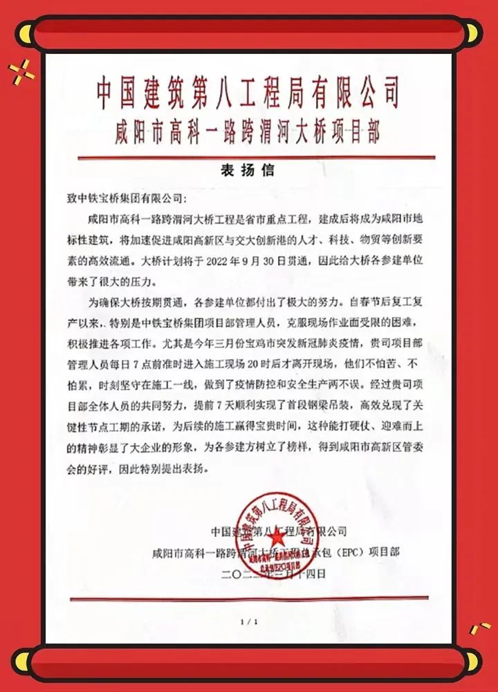 日前,中铁宝桥集团收到来自中国建筑第八工程有限公司的表扬信,对中铁宝桥项目部管理人员,这种能打硬仗,迎难而上的工作精神给予肯定。疫情期间,项目部全体人员克服现场作业受限的困难,提前7天顺利实现首段钢梁吊装,高效兑现了关键性节点工期的承诺,得到咸阳市高新区管委会的好评。
