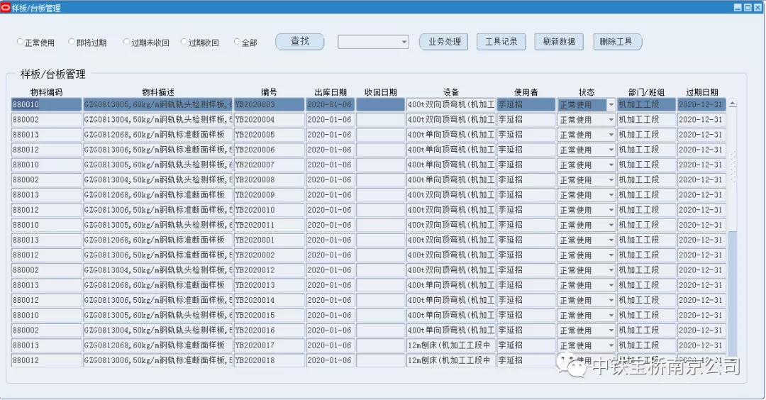 将样板、台板由人工管理提升为ERP系统管理,实现样板、台板采购、检验、领用、报废、仓储全方位系统管理,将管理权限集中,有效降低库存,提升了管理水平,保证了样板、台板在有效期内使用,确保不会出现因样板、台板质量问题导致道岔产品出现质量不过关的情况,同时及时处理报废样板,使得资源合理利用。