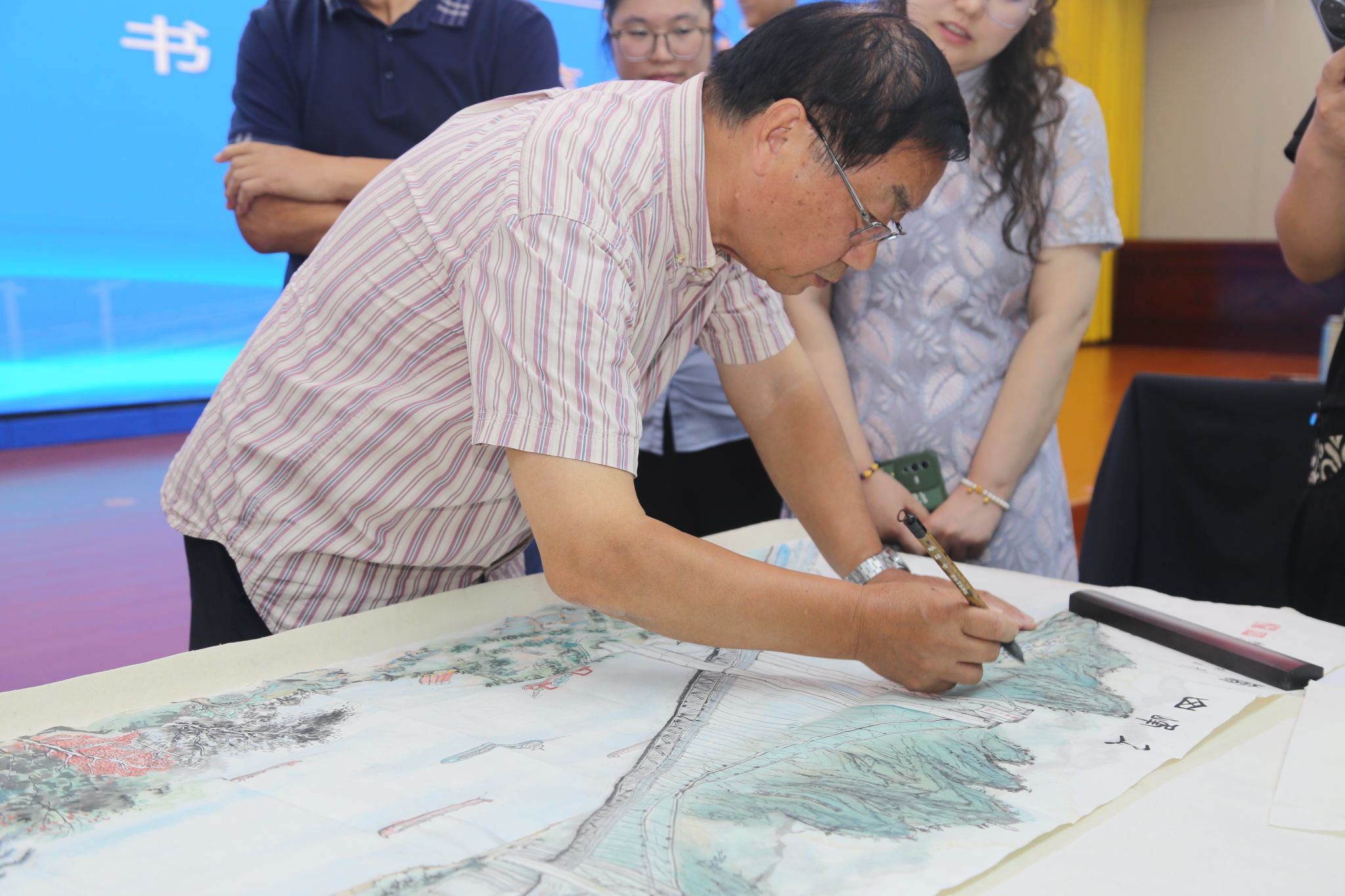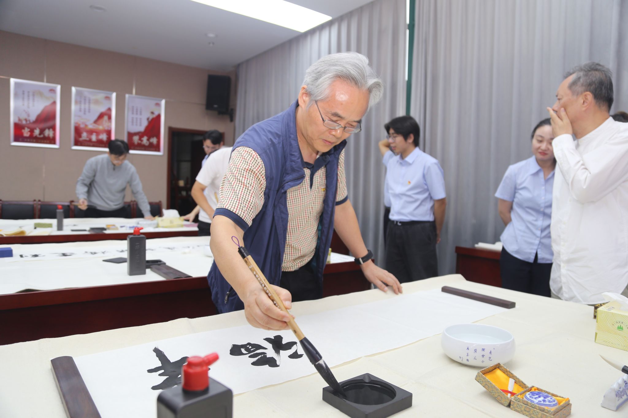 笔尖与灵感的碰撞,是惊艳,是赞美。活动现场,书画家们以笔会友,挥洒自如,或泼墨挥毫,或精雕细琢,行云流水间,一幅幅蕴含深厚文化底蕴,彰显新时代中铁宝桥逐梦前行和江苏省交通行业繁荣发展的书画作品在笔端流淌而出,让人赞不绝口。