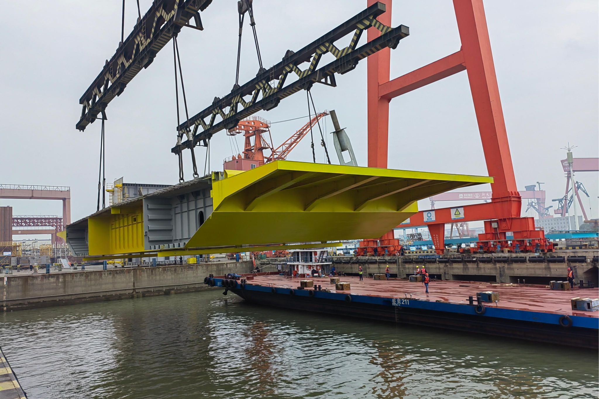 本次发运的首段梁重约586t,长15m,宽47.5m,高8m,首段发运标志着百里洲大桥项目桥位建设工作正式拉开序幕。
