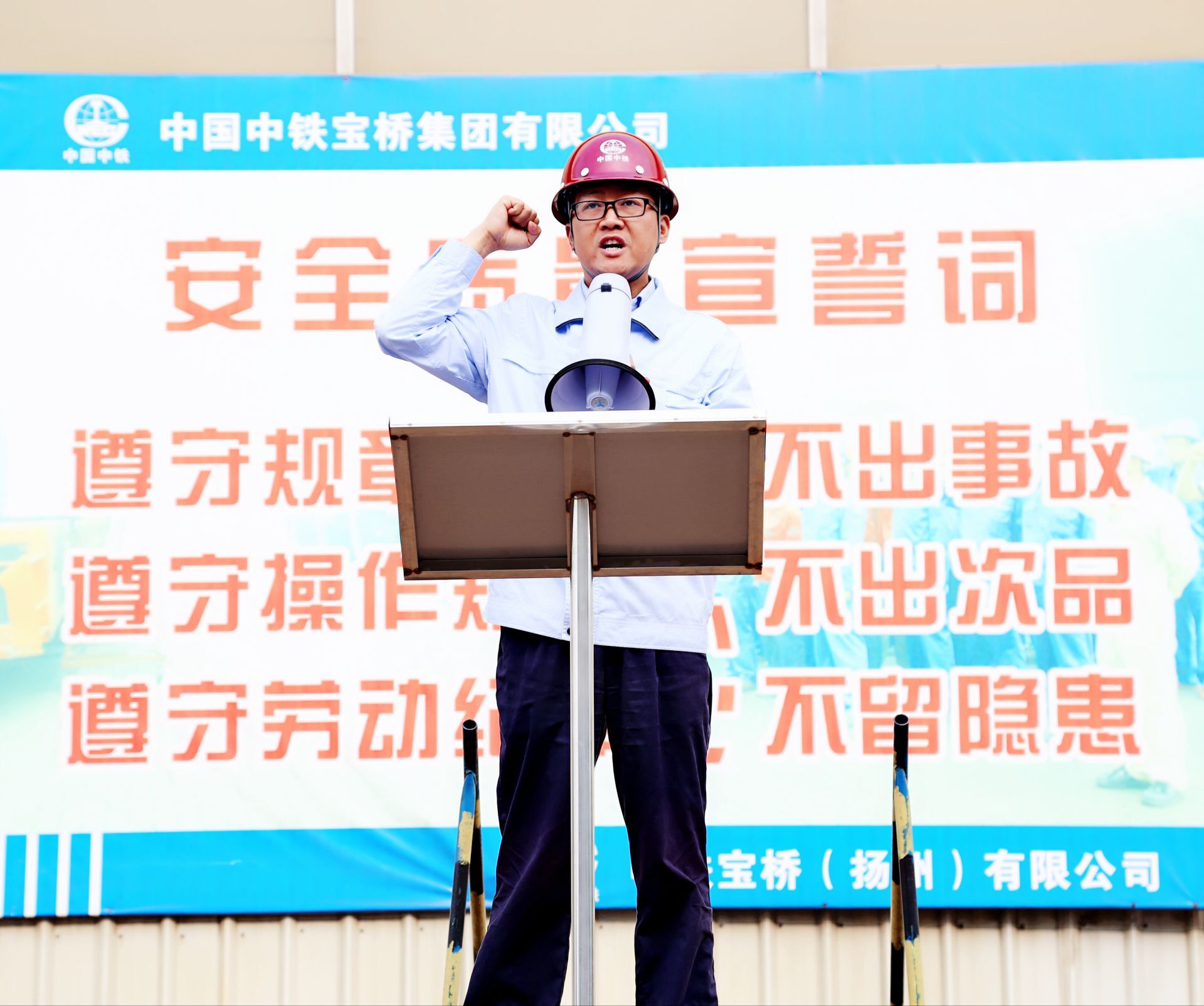 6月1日7时20分,扬州公司全体职工在铆焊联合厂房西侧隆重集会,举行了“安全生产月”动员大会和安全宣誓活动。