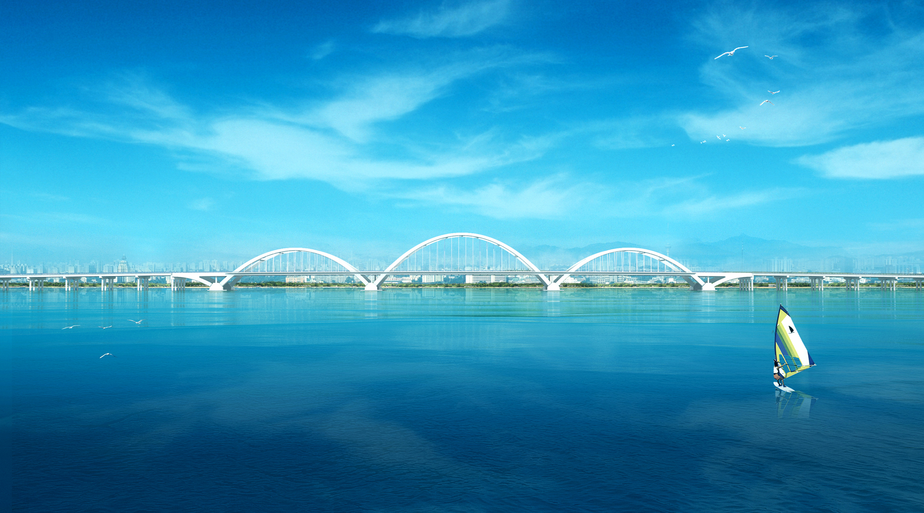 大连普湾新区十六号路跨海桥工程,用钢量约20334吨。主桥为主跨200m的五跨提篮拱桥,其跨径布置为50+170+200+170+50=640m。主桥均处于R=50000m的凸形竖曲线上。主拱为箱型截面,轴线为悬链线,总体内倾9°主跨拱肋跨径200m,矢高61.54m,矢跨比为1/3.25。次边跨拱肋跨径170m,矢高44.46m,矢跨比为1/3.82。两片钢拱由风撑和拱间横联连接。拱肋在拱脚处通过拱座连接,与主墩固结。主梁为钢-混凝土组合梁结构。由边纵梁、横梁、小纵梁组成的纵横梁体系,其上设混凝土桥面板。 主材采用Q345qENH、Q345qENH-Z15和Q420qENH钢材,在国内桥梁制造上首次采用,大量的焊接试验和Z向拉伸试验,加大了制造成本;主要焊缝的熔透要求和不同位置的焊接,加大了焊接难度,尤其是钢度较大的钢拱肋横向及环形焊缝的内部质量的保证是焊接技术的难题。