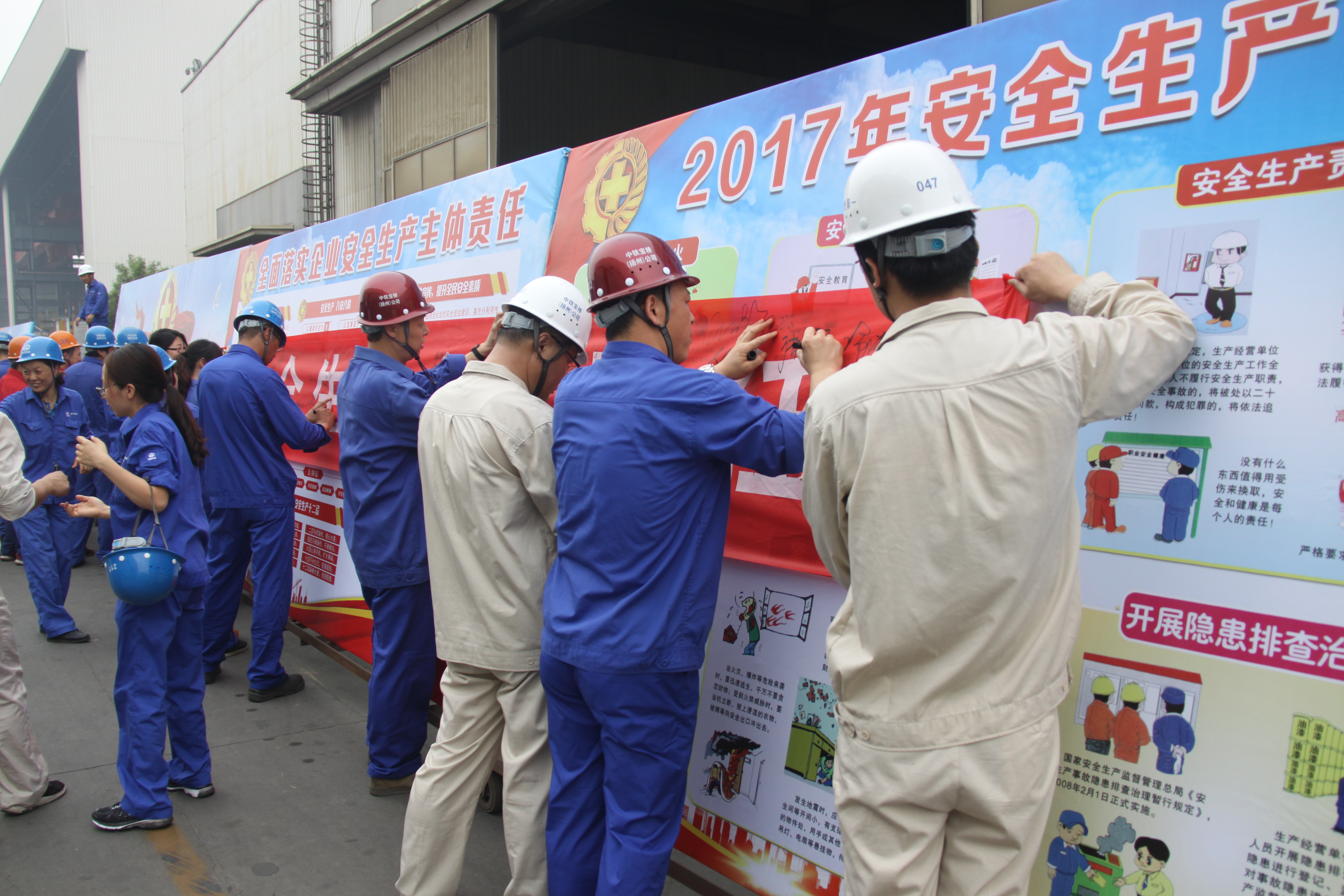 会上,全体职工在总经理张永利的带领下进行了安全质量宣誓。600多名职工着装统一,高举右拳庄严宣誓。字字铿锵有力、句句声音洪亮,他们将用实际行动扎实有效地开展安全生产活动,确保企业生产安全、产品优质。随后副总经理吴小兵对安全月活动提出具体要求并做安排部署。全体职工在“全面落实企业安全生产主体责任”条幅上进行安全承诺签字活动。通过签字活动,让每一位职工进行安全承诺,进一步激发职工的安全责任感,提升全员安全生产意识,杜绝轻伤、消灭重伤事故。“安全月”活动期间,扬州公司将紧密围绕“全面落实企业安全生产主体责任”这一主题,为深入开展好安全活动,重点开展以下工作:一是自5月31日起,持续一个月时间,公司在办公楼前、铆焊联合厂房西门外摆放安全生产月活动宣传展板,在生产区域悬挂安全生产、环境标语横幅,利用公司办公楼电子屏滚动播放安全、环境标语、口号,广泛发动员工参与,营造安全月活动气氛;二是召开2017年安全生产工作会议,总结以往公司安全生产管理工作并安排部署今后的安全生产工作重点,表彰2016年度在安全生产管理方面的先进单位、先进班组和先进个人,同时公司和各部门签订安全生产责任状;三是安监环保部、设备保障部等部门联合组织,针对起重工、天车司机等特种作业工种开展规范操作、安全生产技能等专题教育活动;四是利用工余时间,组织全体班组长及安全管理人员开展安全管理知识讲座,使其牢固树立“管生产必须管安全”的管理理念,增强他们的安全责任意识;五是结合生产实际,针对安全用气、安全用电、定置管理、起重吊装、高处作业、劳保穿戴、环境卫生等安全环境隐患项点,开展每周不少于一次的专项安全检查工作,形成隐患排查治理高压态势,保障公司安全生产;六是组织开展事故应急救援演练活动。6月下旬,开展“起重伤害”事故应急救援演练,增强员工的安全防范意识,提高员工的应急自救、互救能力;七是组织各部门与班组长签订《安全生产承诺书》、《班组长安全责任书》;八是落实夏季员工防暑降温和露天氧气瓶、丙烷气瓶和二氧化碳气瓶的防晒防护工作。