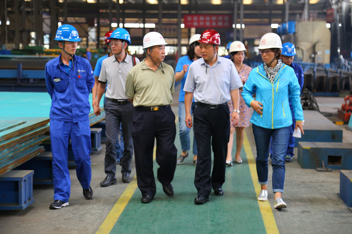 钟振光一行首先深入铆焊联合厂房、总拼厂房、码头实地进行了参观,详细了解了公司生产布局、设备及生产组织情况。接着,在公司三楼会议室听取了公司简要情况、技术力量及认证资质、虎门二桥项目党建工作、项目工作进展、技术成果应用等情况汇报。