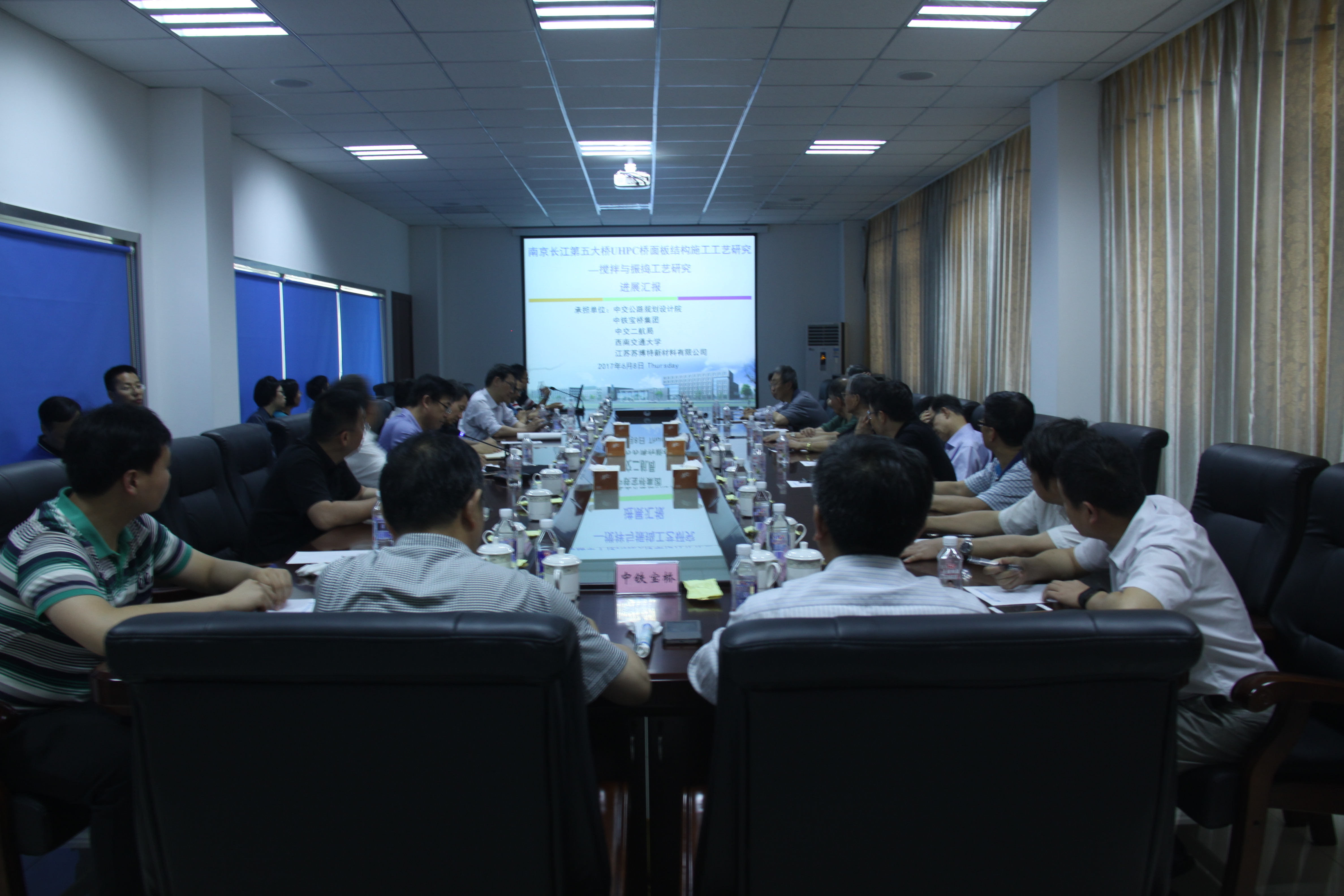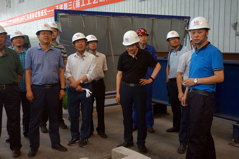 各位专家、领导及有关单位代表首先深入机械加工车间实地进行了参观,详细了解了南京长江第五大桥含粗骨料UHPC桥面板施工工艺试验过程,现场参观振捣、抹平一体式设备的实际运行情况。接着,在公司一楼会议室听取了中交公路规划设计院所作的关于南京长江第五大桥含粗骨料UHPC桥面板试验研究报告。专家们对南京长江第五大桥UHPC桥面在施工工艺方面提出了宝贵建议。