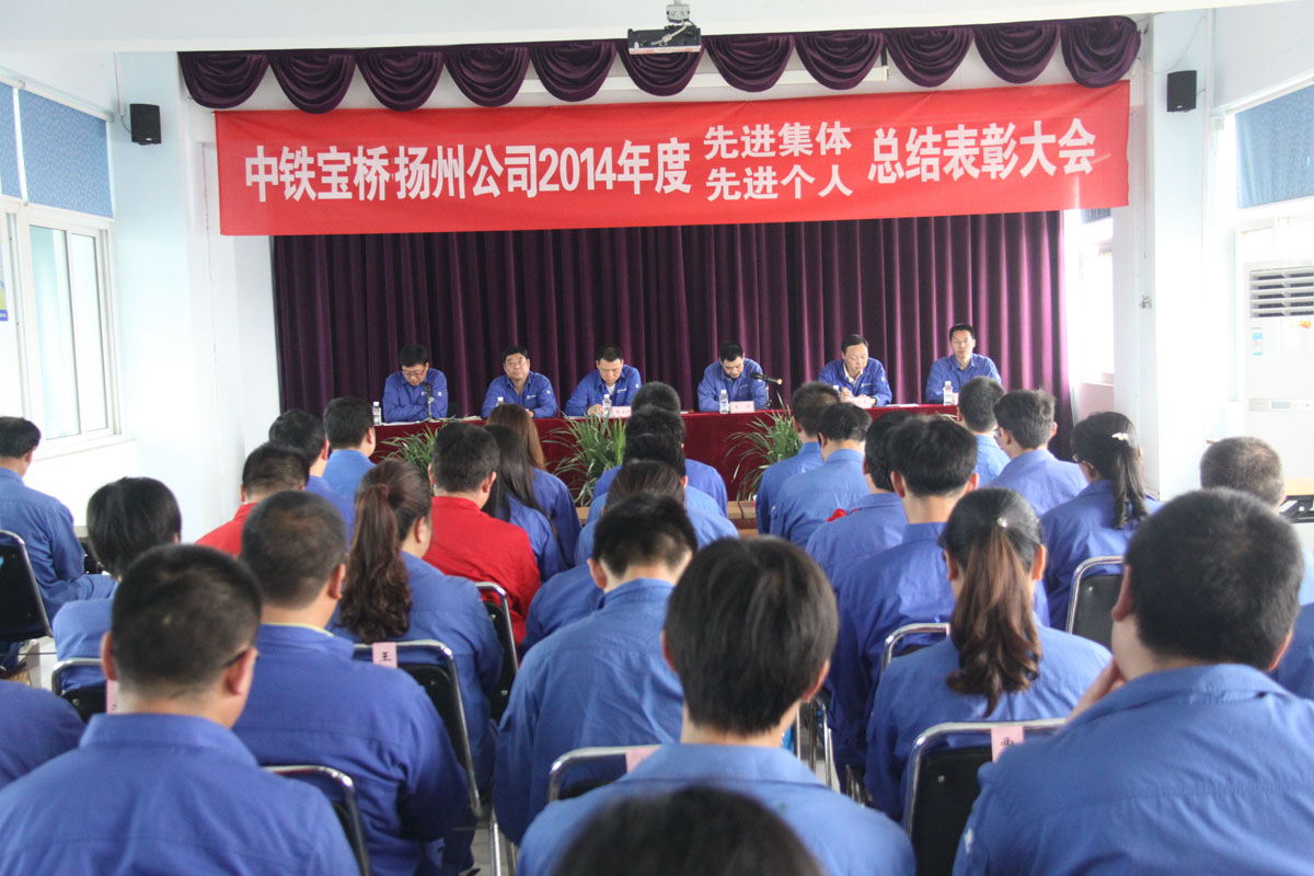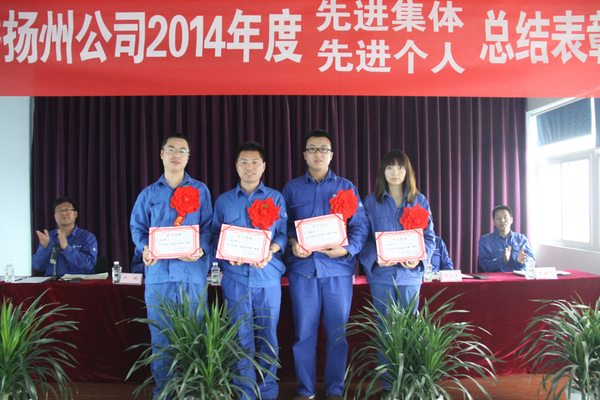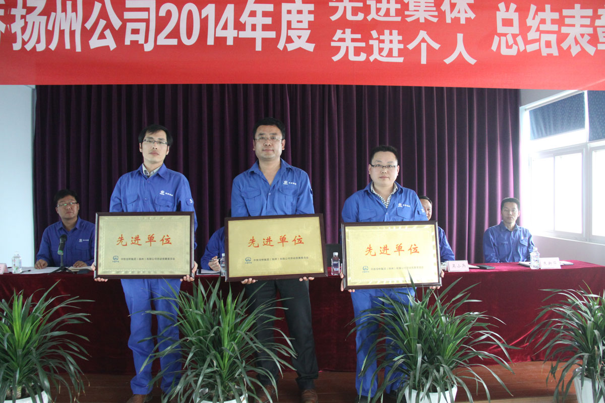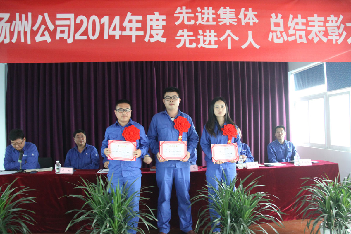 4 月28日下午,扬州公司在办公楼五楼会议室隆重召开2014年度先进集体、先进个人总结表彰大会。大会由公司党委副书记、纪委书记、工会主席李正主持,公司党委书记李硕、总经理张永利、副总经理吴小兵、副总经理卢刚、总工程师朱新华出席会议。公司“四长”以上管理人员及受表彰的先进集体代表和先进个人110 余人参加了大会。
