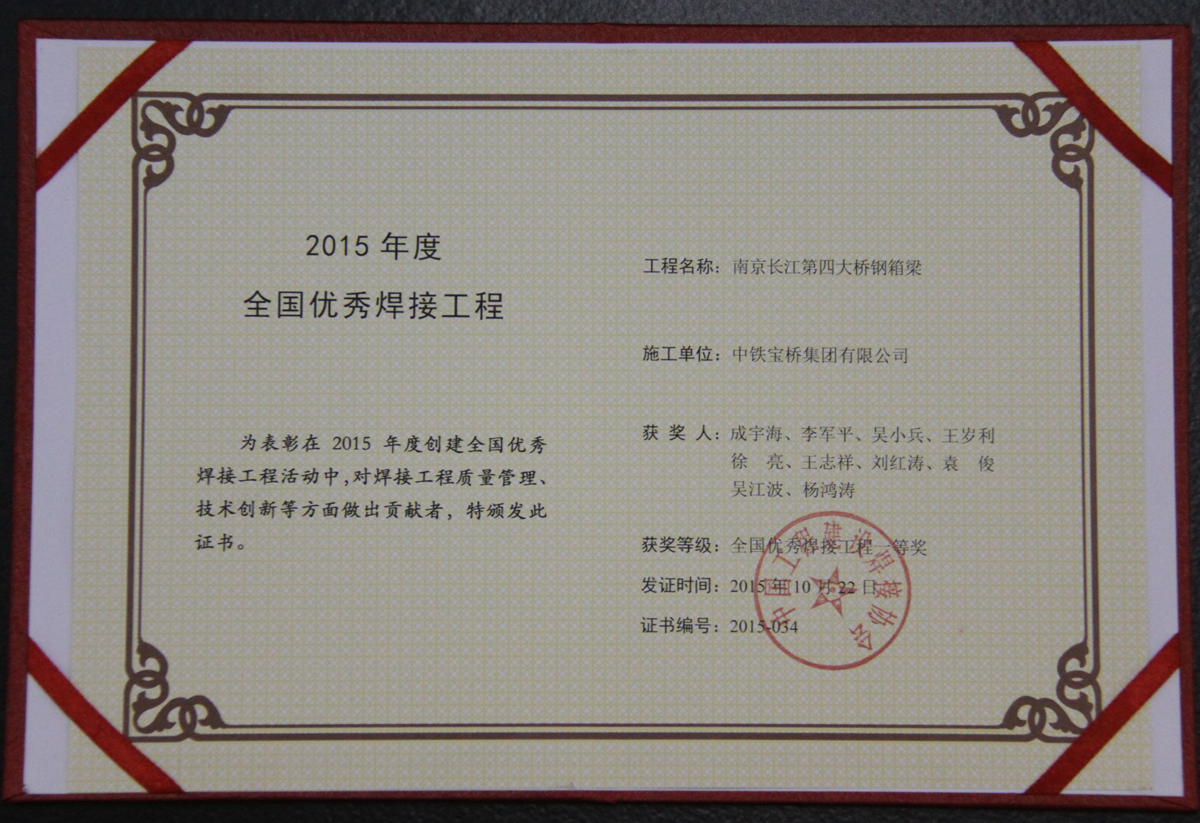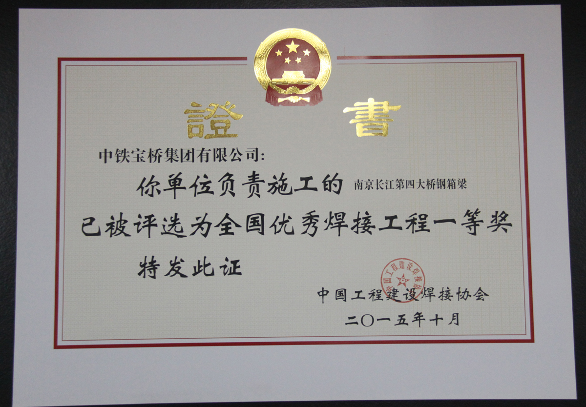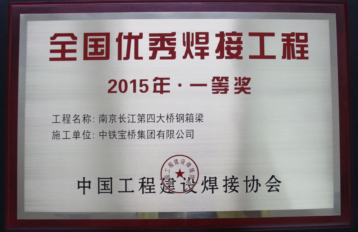 近日,由中铁宝桥承建的南京长江第四大桥被中国工程建设焊接协会评为全国优秀焊接工程一等奖。