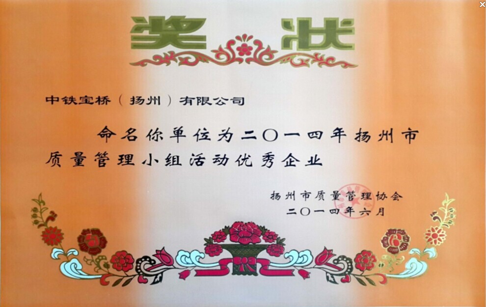 近日,由扬州公司质管QC小组编写的《港珠澳大桥钢主梁腹板单元制作质量控制》QC成果,荣获集团公司QC成果发表评选一等奖的基础上,在扬州市、江苏省众多成果中以优异的成绩,分别荣获2014年扬州市和江苏省优秀QC成果奖,扬州公司荣获“二0一四年扬州市质量管理小组优秀企业”、扬州公司质管QC小组荣获“江苏省二0一四年优秀质量管理小组”,同时QC小组组长马增岗、发表人杨小军分别获得扬州市“卓越领导者”和“优秀推进者”等荣誉。