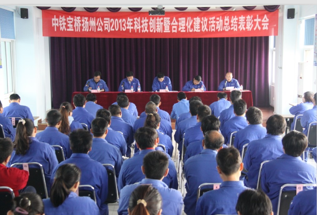 11月23日上午,扬州公司隆重召开2013 年科技创新暨合理化建议活动总结表彰大会。会议由工会副主席李正主持。扬州公司总经理李硕、党委书记侯映晖、副总经理卢刚、总工程师李军平、副总经理雍晓刚、总会计师黄景学及副总工程师王岁利出席大会。受表彰的科技创新及合理化建议项目代表及“四长”以上人员共96人参加了大会。