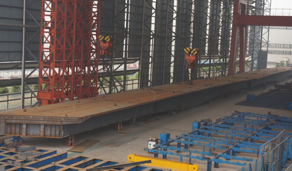 新建铁心桥位于南京雨花台区,跨越秦淮新河。采用三跨变截面连续钢箱梁,跨径布置为(39+75+39)m,中跨矢高1.83米,分四幅建造(分为左左幅、左幅、右幅、右右幅),左左幅、右右幅钢箱梁桥宽为8.0m,全长156.2m;左幅、右幅钢箱梁桥宽为13.0m,全长158.3m。总计40个梁段。总吨位钢箱梁约3000吨。此次预拼装的为左左幅L1-L5、L6-L10。
