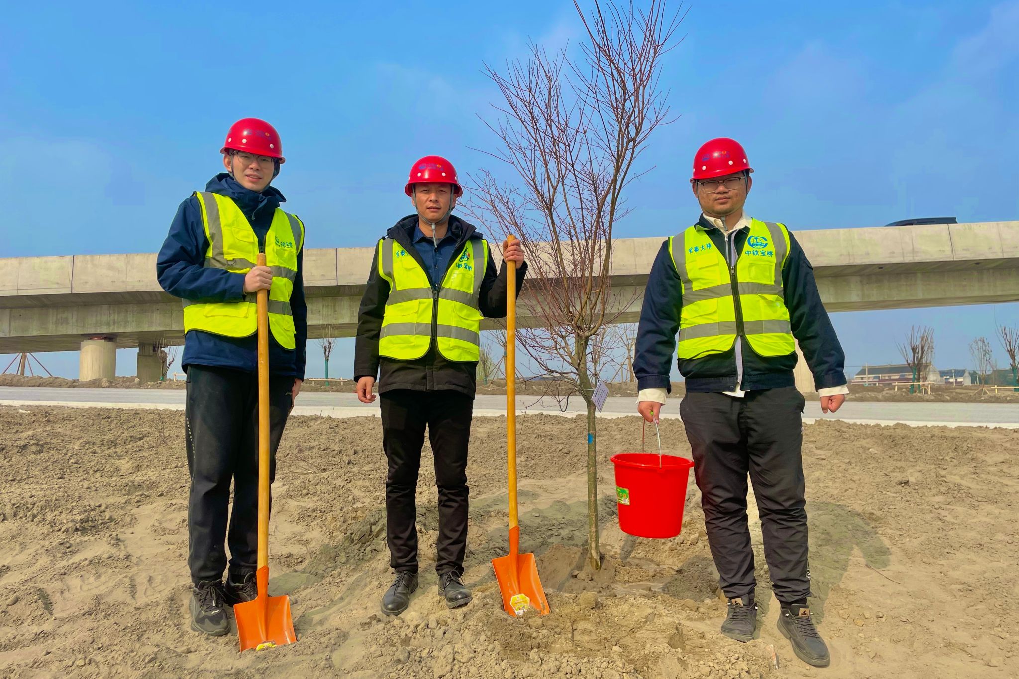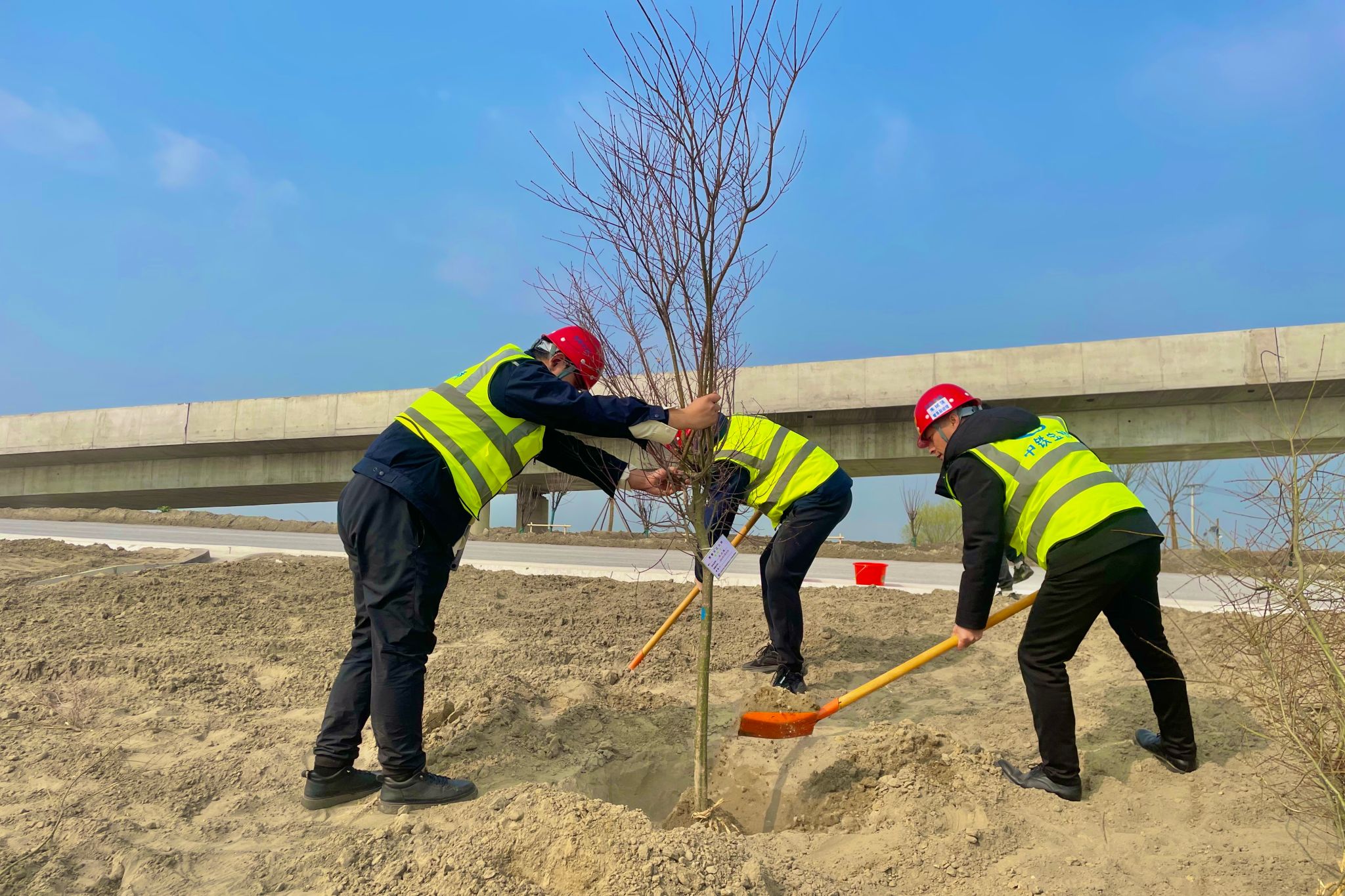 在常泰长江大桥北接线泰兴东互通的植树现场,“小青团”们默契配合,一棵棵树苗“安营扎寨”,在和煦的春风中展现蓬勃的生机。