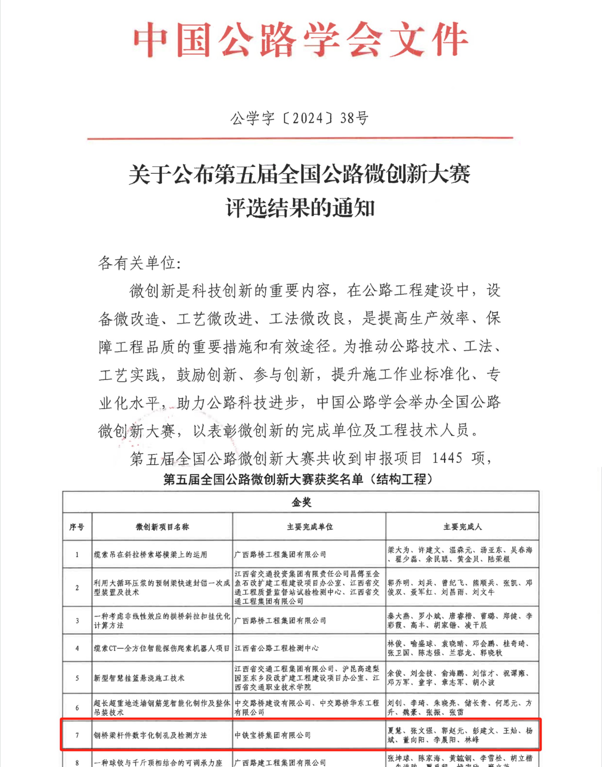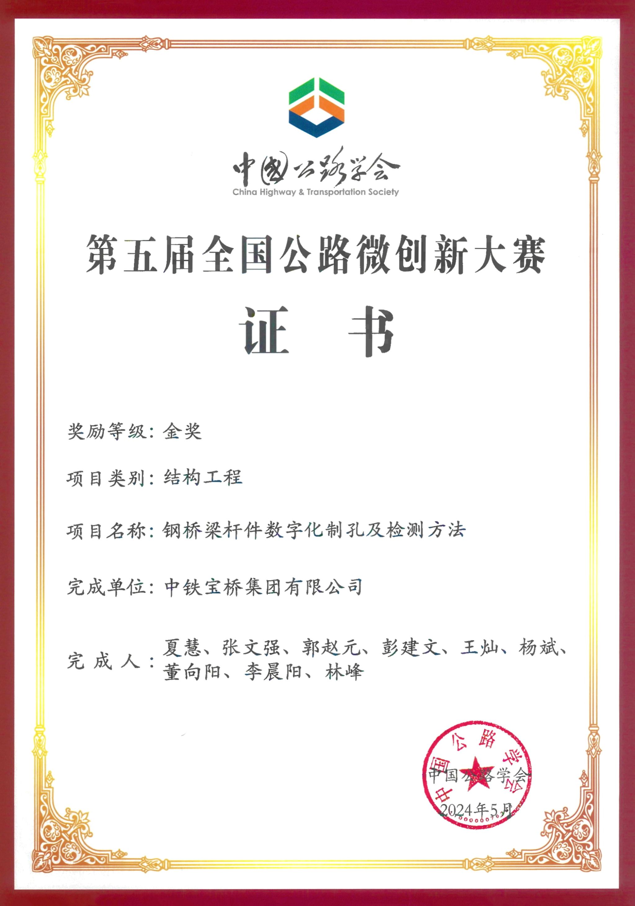 近日,中国公路学会第五届全国公路微创新大赛评审结果揭晓,经过激烈角逐,中铁宝桥扬州公司项目团队申报的“钢桥梁杆件数字化制孔及检测方法关键技术”斩获大赛最高奖项——金奖。