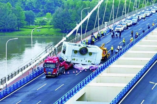 近日,一辆过江货车在经过夹江大桥时剐蹭到主缆、吊索后侧翻,所运大型货物坠落桥面,导致桥梁局部构件受损。