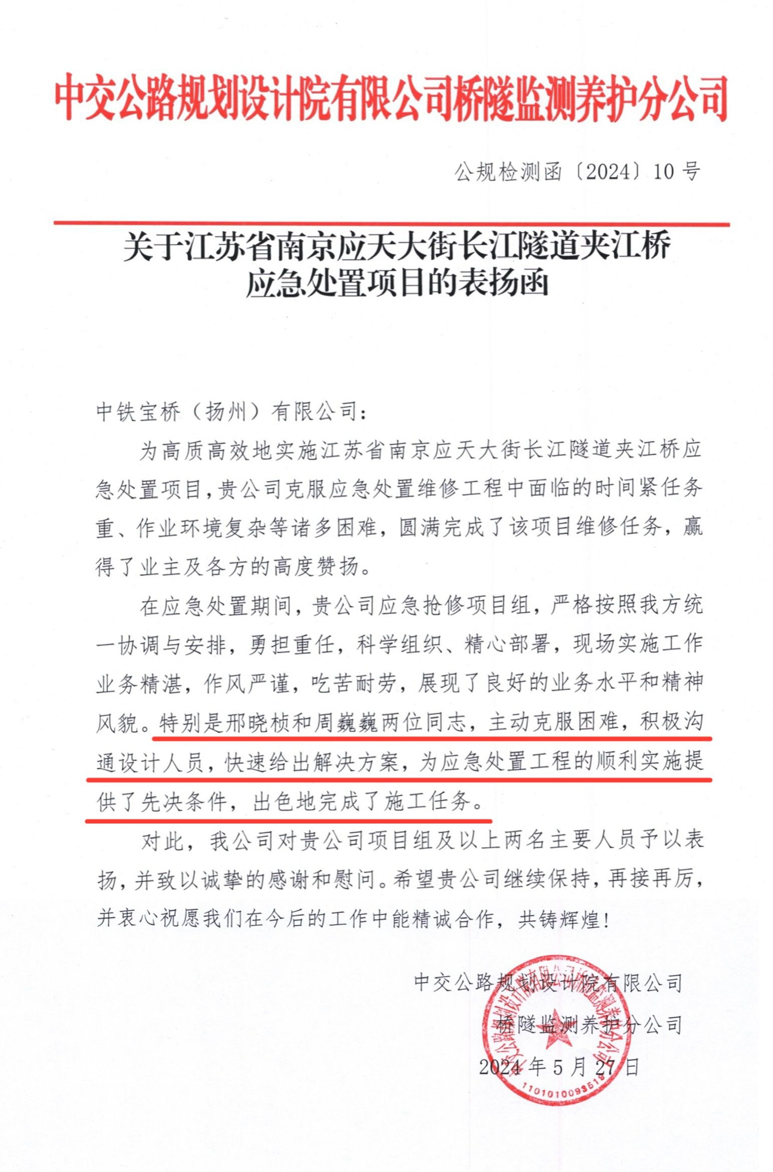 表扬是赞誉亦是信任。未来,扬州公司会持续增强桥梁维修的专业能力与服务水平,以卓越服务品质打造桥梁维修的宝桥“金名片”。