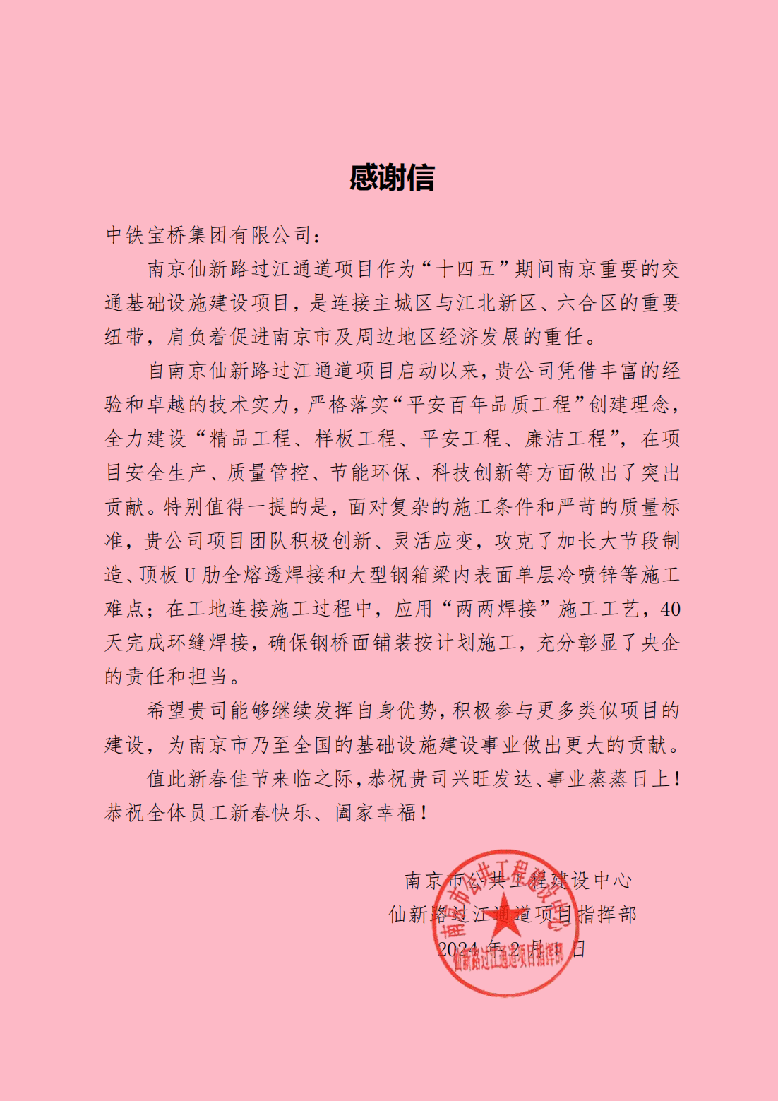 南京仙新路过江通道是“十四五”期间南京城市发展的重大工程项目,也是南京“高快速路系统”的重要组成部分,为目前国内第一、世界第二大悬索桥,中铁宝桥承建约2.8万吨钢梁生产制造。建成后对进一步提升长江干线过江能力、完善区域路网体系,具有十分重要的意义。