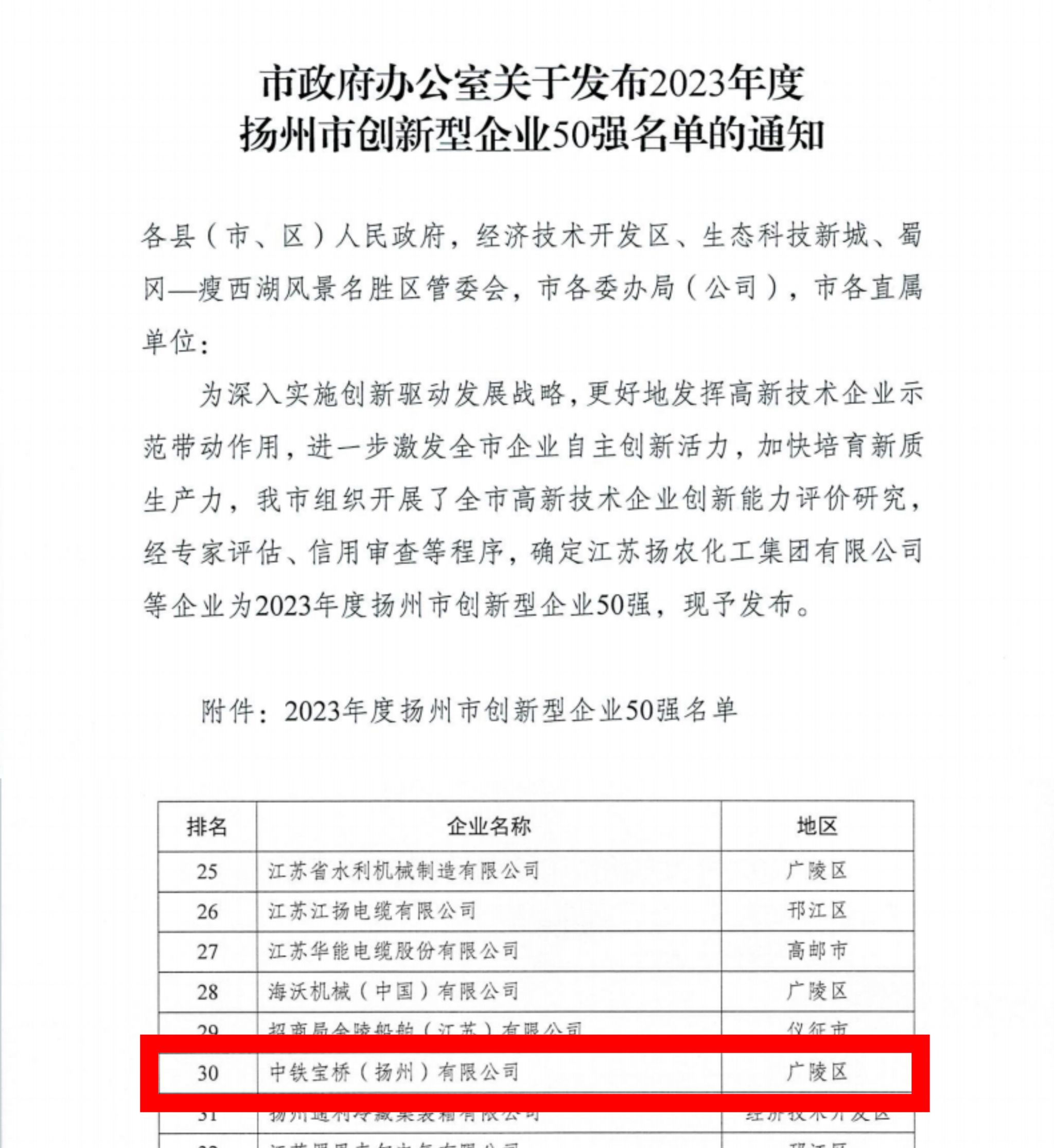 创新型企业50强评选是参照江苏省百强创新企业评价体系,结合扬州地方特点,对全市高新技术企业的创新能力和水平进行综合评价。依据企业创新投入、创新产出、创新绩效和创新管理四个可量化、可对比指标,综合考量企业管理创新、参与标准制定、国家和省级研发机构创建、创新人才建设等方面情况。